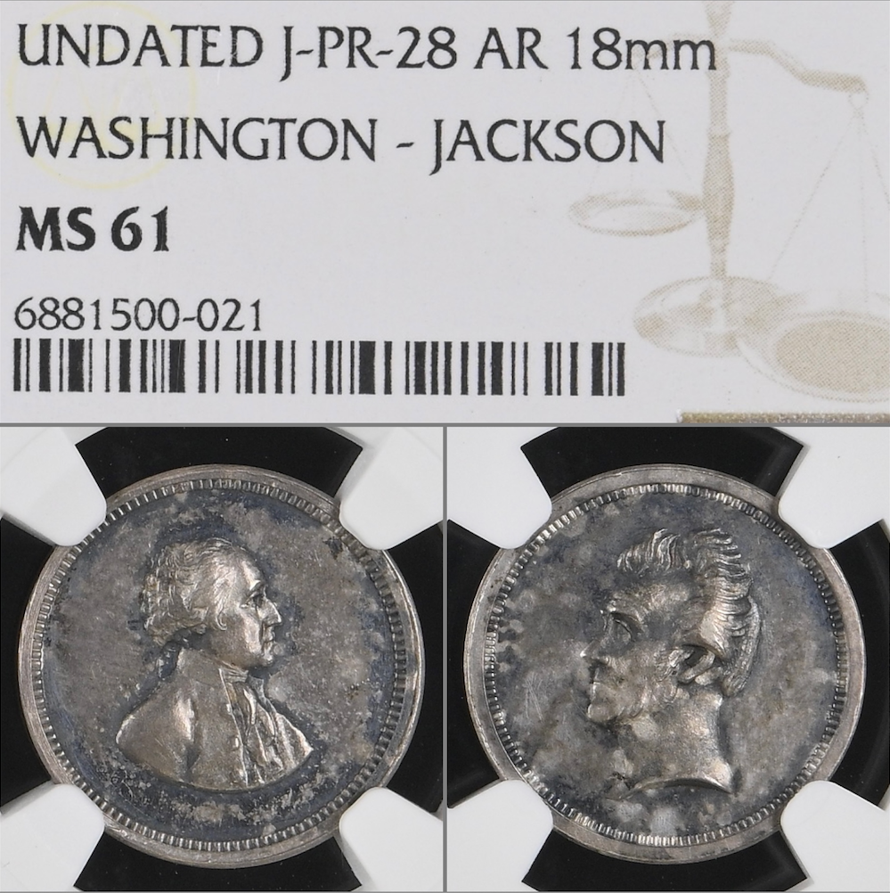 Super neat political token featuring high relief busts of George Washington and Andrew Jackson. Minted in the mid 19th century. The surfaces appear proof like underneath the original bluish grey toning.