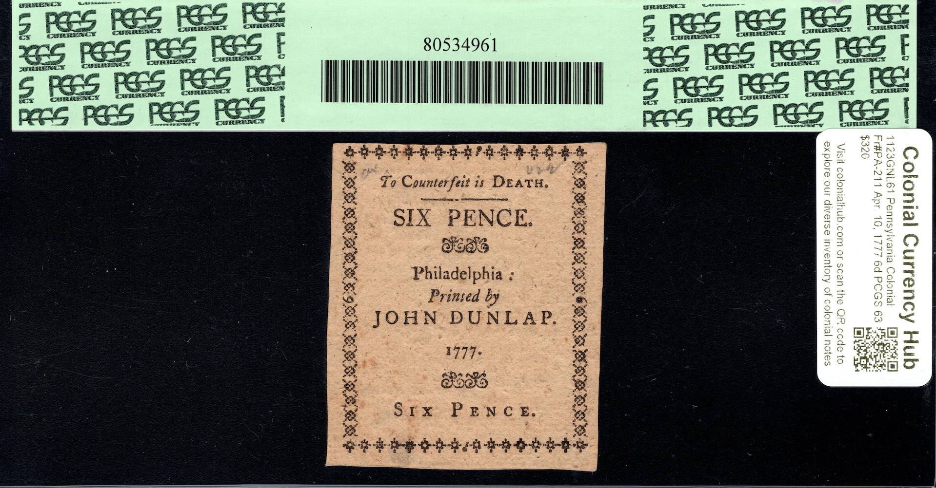 The bills of the April 10, 1777 Pennsylvania issue were passed for the purpose of supporting the army. This note was printed by John Dunlap on paper containing mica flake. This Pence note is small in size and printed in black ink. The Penn Arms are present on the front with a ship and farming motifs. “To Counterfeit is DEATH” can be clearly read across the top of the simple but elegant reverse. Exceptional example with bold ink and crisp light paper with a large piece of mica showing on the reverse. This example also has a very neat watermark made up of multiple “PENNSYLVANIA” watermarks. Previously a part of the iconic Ford Collection.
