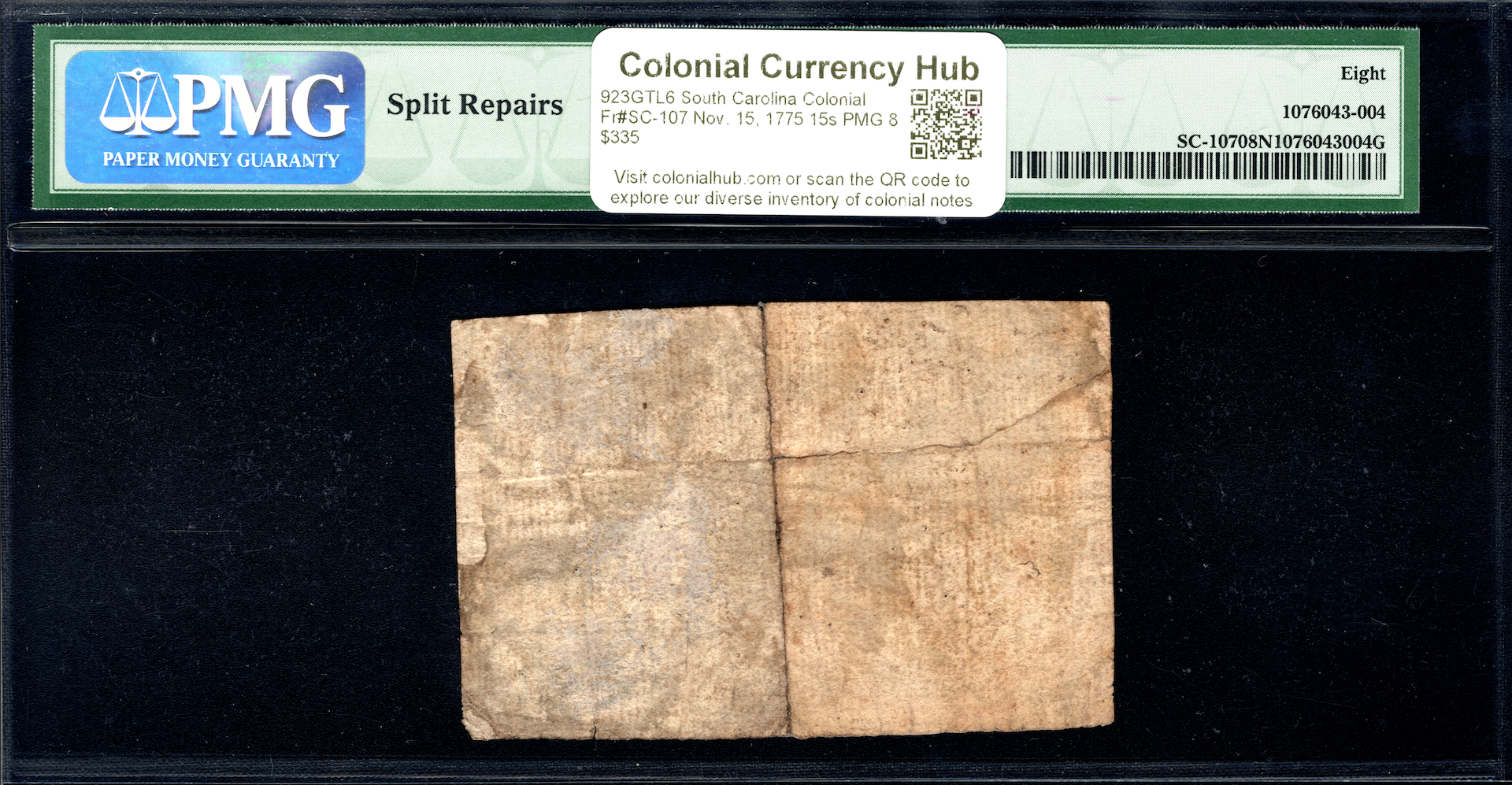This note from the November 15, 1775 South Carolina issue is small in size and features a neat seal with the denomination of the note surrounded by a wreath. This note was printed and engraved by James Oliphant with a blank reverse. Incredibly scarce, of the 10,000 15 shilling notes originally printed only 6 are known to survive today. Very nice legibility for the grade.