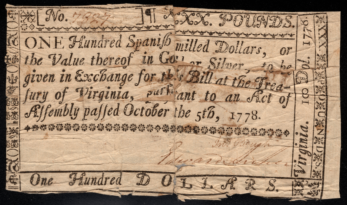 Examples from the October 5, 1778 Virginia issue are generally scarce. This note was printed on thin paper by Alexander Purdie and Clarkson & David. The $50 and $100 bills from this issue are much larger in size compared to the lower denominations and feature typeset design with ornate boarders rather than the state seal. Affordable example. Of the 9,597 originally printed, only 18 are known to survive today.