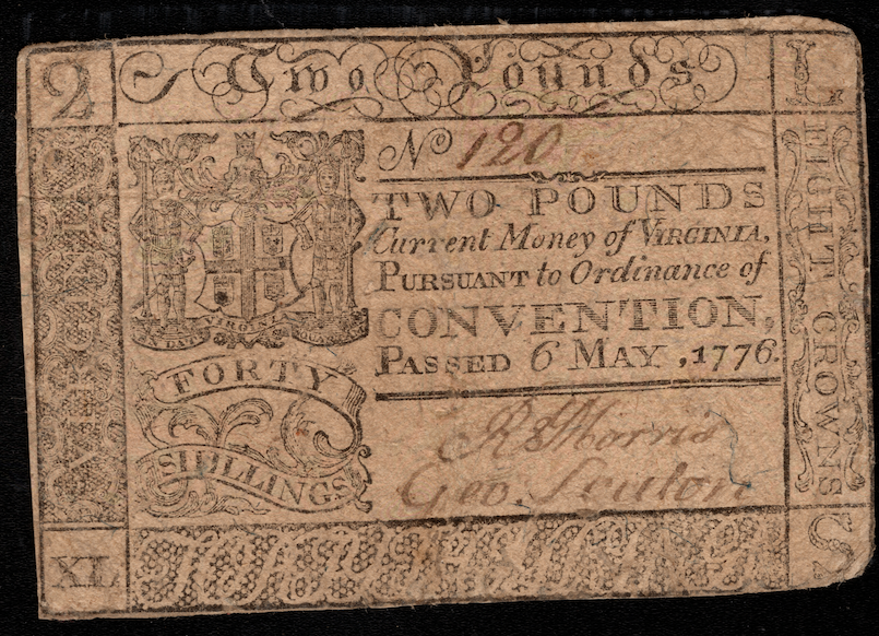This Virginia issue utilized cast cuts from the previous issue, slightly modifying them with new denominations, boarders, and state arms. This note was printed by Alexander Purdie on heavy rag paper containing blue threads and mica flakes. Incredibly nice example for the grade. Of the 1,000 originally printed, only 3 examples are known to exist today with this note being the finest. Previously a part of the renowned Ford-Boyd Collection.
